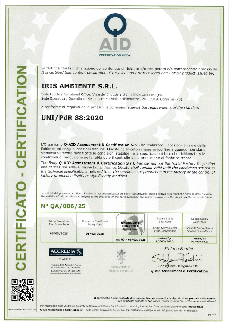 IRIS AMBIENTE S.R.L. è certificata a livello europeo secondo la normativa UNI EN ISO 9001:2015 (per i requisiti di gestione per la qualità nell’organizzazione), UNI EN ISO14001:2015, UNI EN ISO 45001:2023 ed UN/PdR 88:2020.